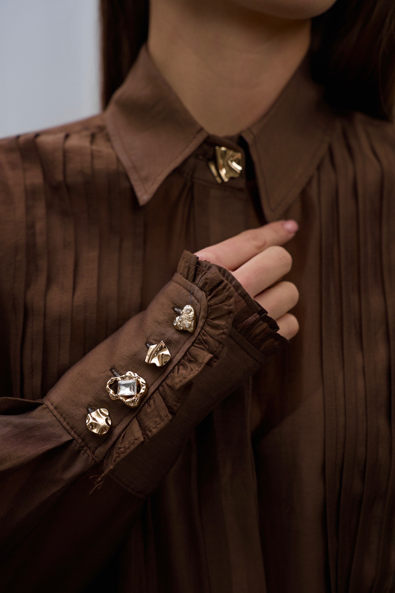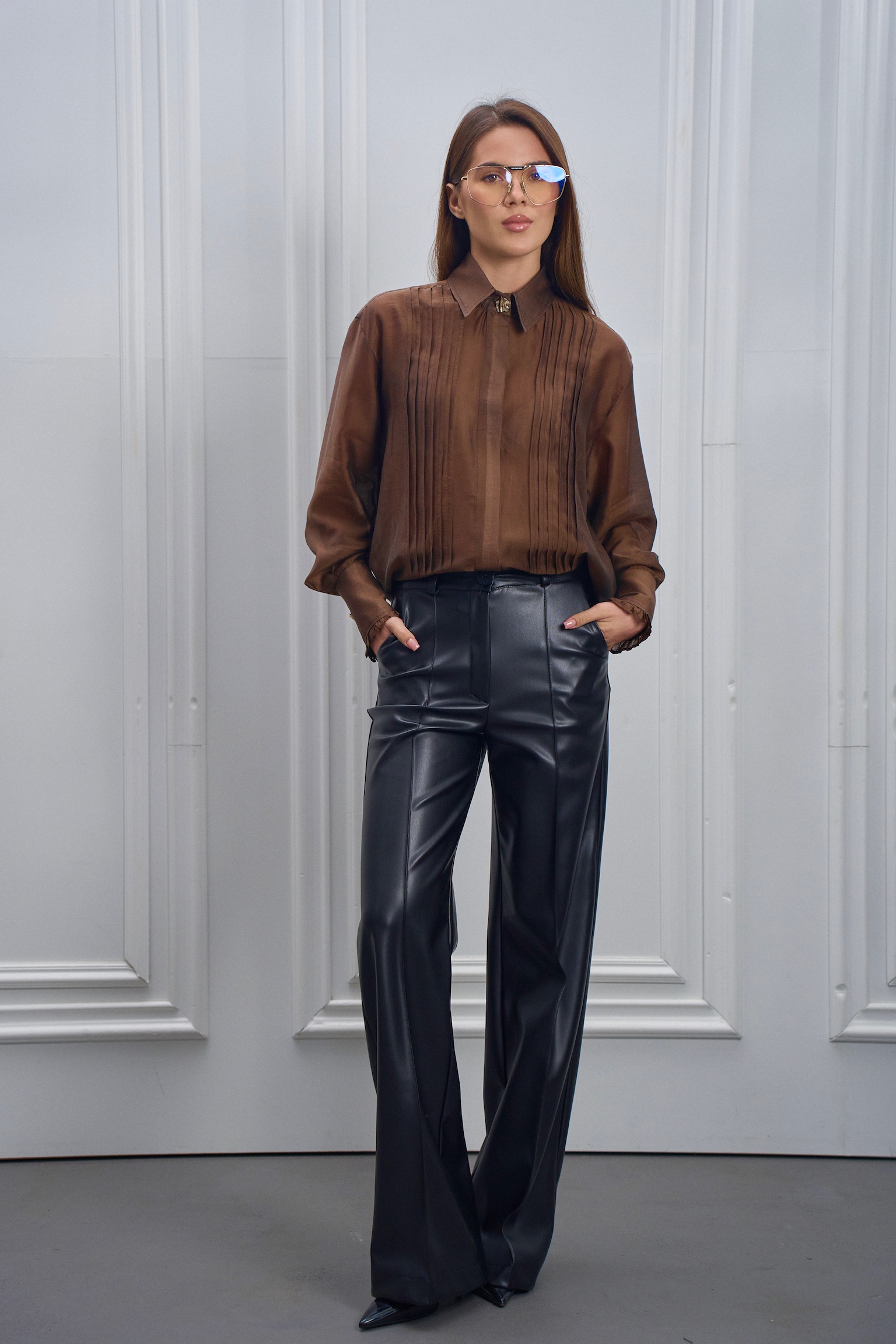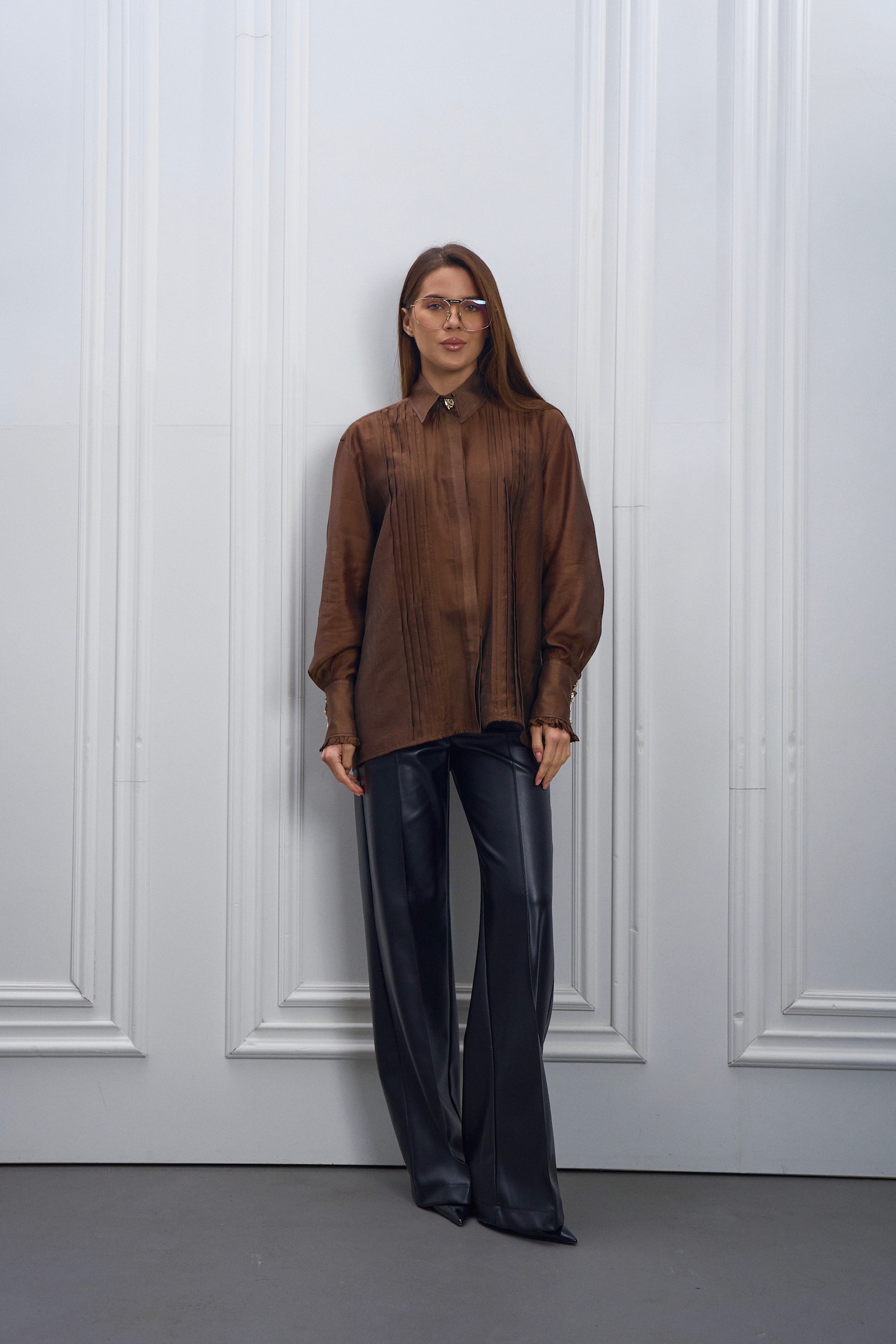 - Декоративні вертикальні складки спереду додають образу витонченості та візуально подовжують силует, а класичний комір робить модель універсальною для щоденного гардероба
