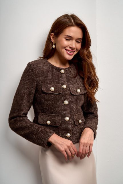 - Декоративні вертикальні складки спереду додають образу витонченості та візуально подовжують силует, а класичний комір робить модель універсальною для щоденного гардероба