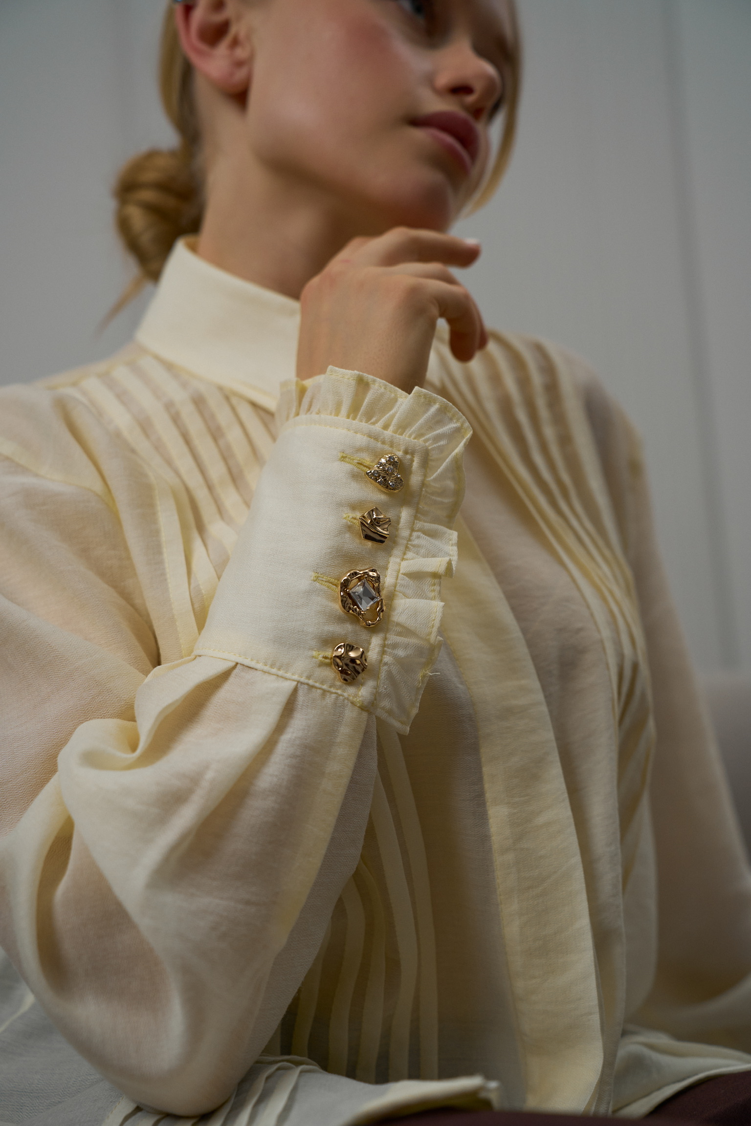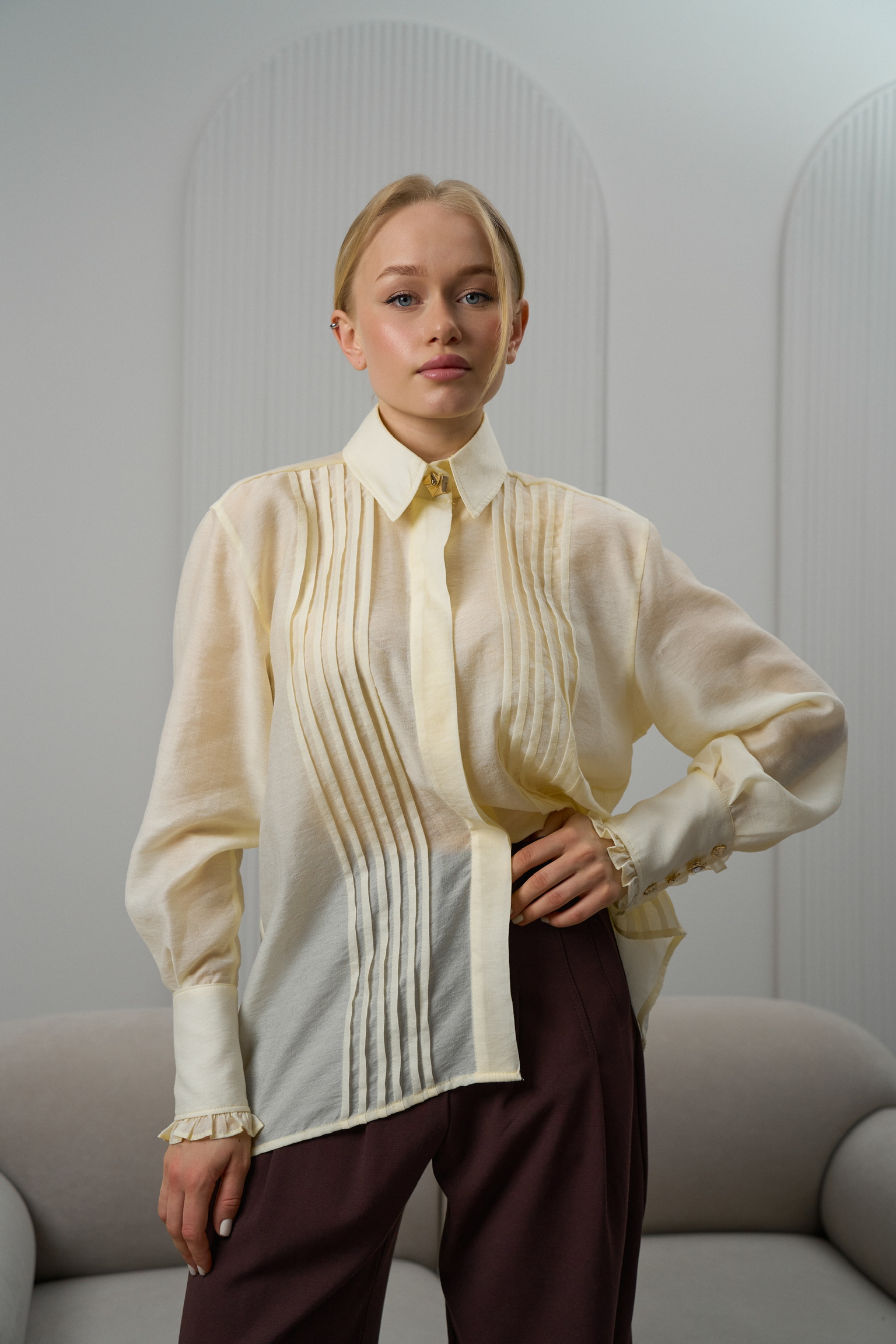 - Тканина має легкий благородний блиск, завдяки чому блуза виглядає вишукано та дорого