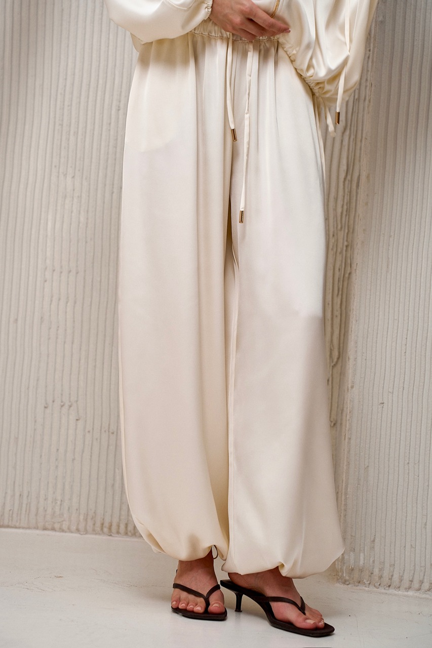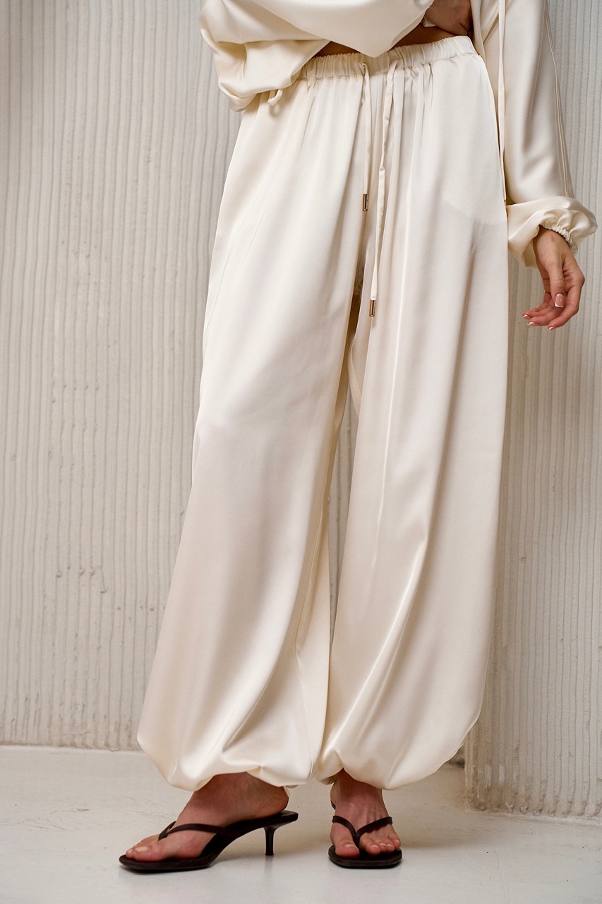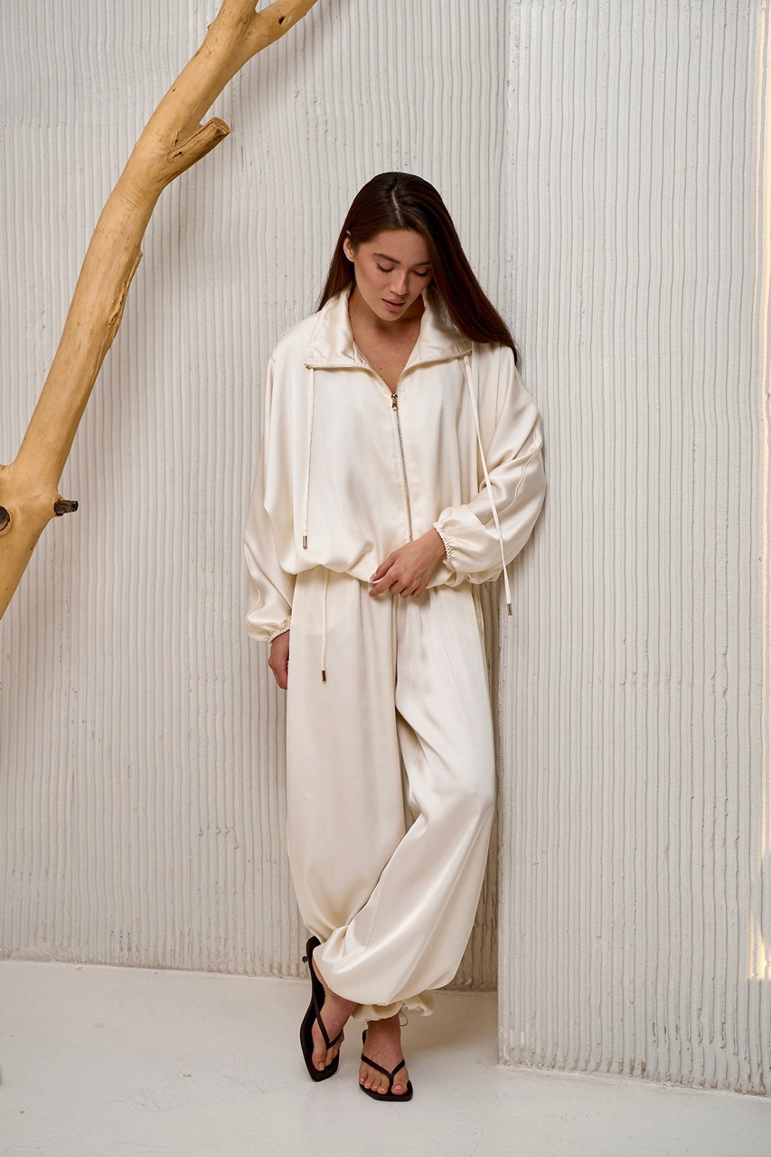 Костюм, у якому поєднуються легкість, комфорт і витончений стиль. Виконаний із королівського шовку, він м’яко струмує по силуету, даруючи делікатний блиск і відчуття тихої розкоші в кожному русі.
